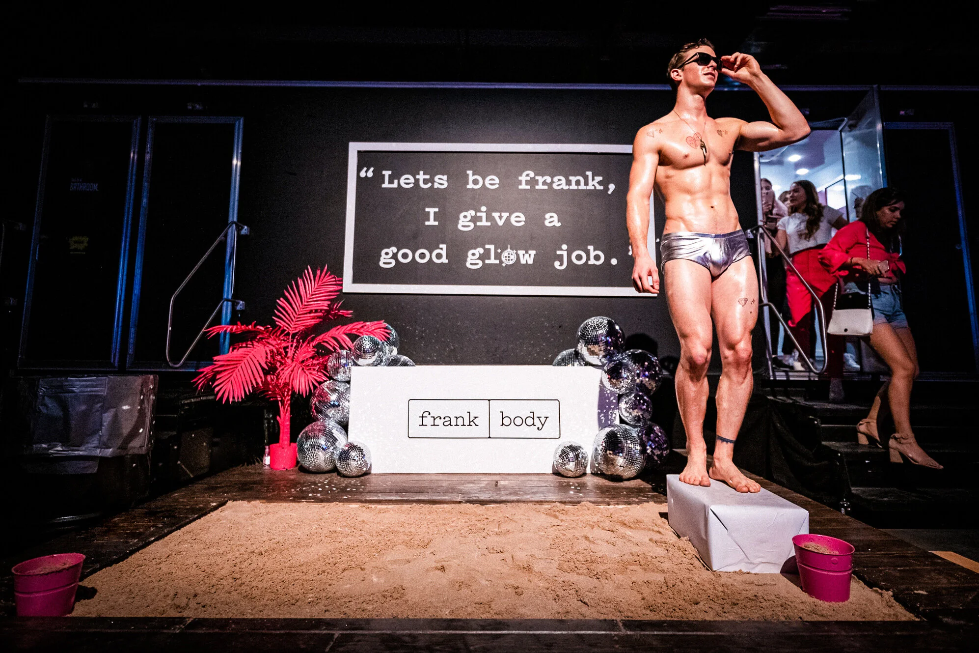 Lets be frank, all the best parties end up pant less and covered in shimmer. Since winter sucks, Frank Body partnered with Babe Rosé to bring a beach party to a warehouse in Brooklyn. The heat was cranked to 85 degrees and a dumpster was turned into a pool. My partner and I were tasked in creating an active activation that captured the brand DNA of the Australian coffee scrub but also was in line with the party scene of Babe Rosé and the Fat Jewish. Also we had to feature Frank’s Shimmer Scrub, that moisturizes & leaves your skin with a shimmering glow that's out of this world.